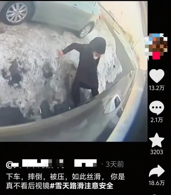 经记者搜索了解,该女子在社交平台发布了相关视频,并带文案称,“下车,摔倒,被压,如此丝滑,你是真不看后视镜”,同时带上了“雪天路滑注意安全”的提醒。
