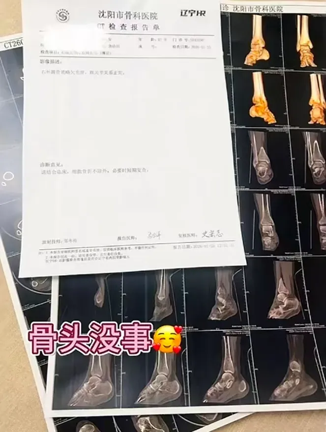 该女子在评论区也说明了当时的情况,同时晒出了去医院的检查报告单,称“骨头没事”。