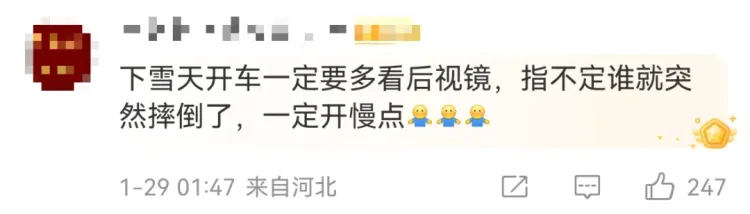 对此,网友纷纷留言。有网友提醒,“下雪天开车一定要多看后视镜,指不定谁就突然摔倒了,一定开慢点”,也有网友称,“这也太黑色幽默了”。还有不少网友在评论区分享自己的同款经历。